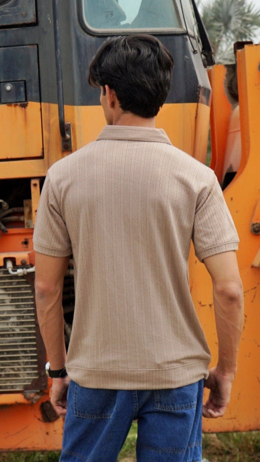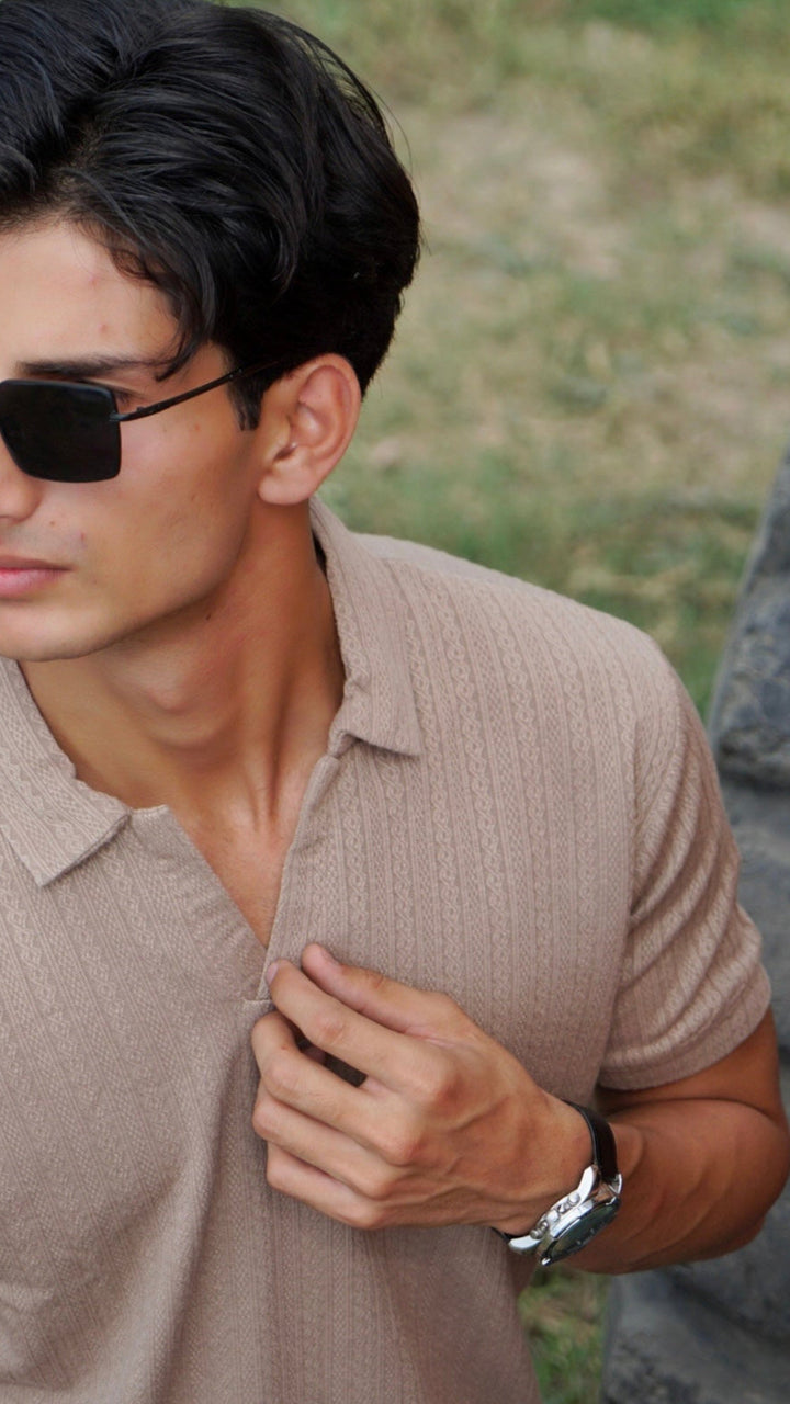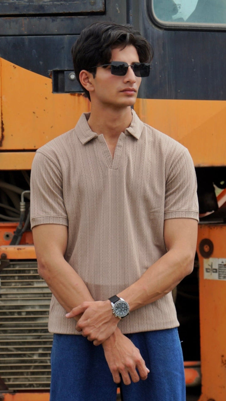 Men's V-NECK Textured Polo - Beige