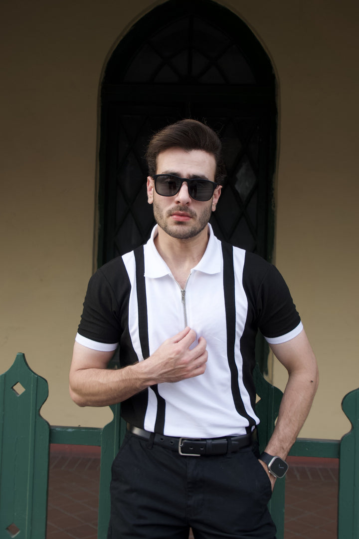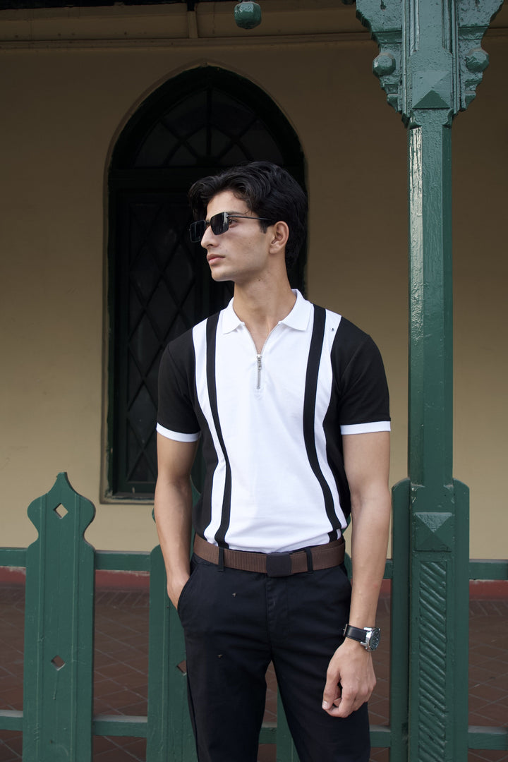 Designed for style and comfort, this black and white polo features a sleek zip-up collar that adds a bold, contemporary edge.
