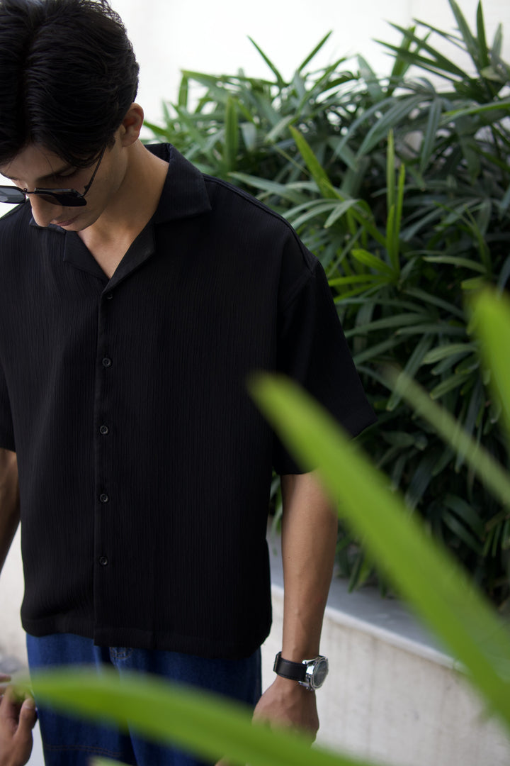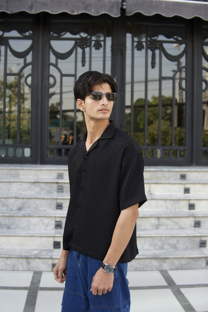 Men's Oversized Drop Shoulder Cuban Shirt - Black